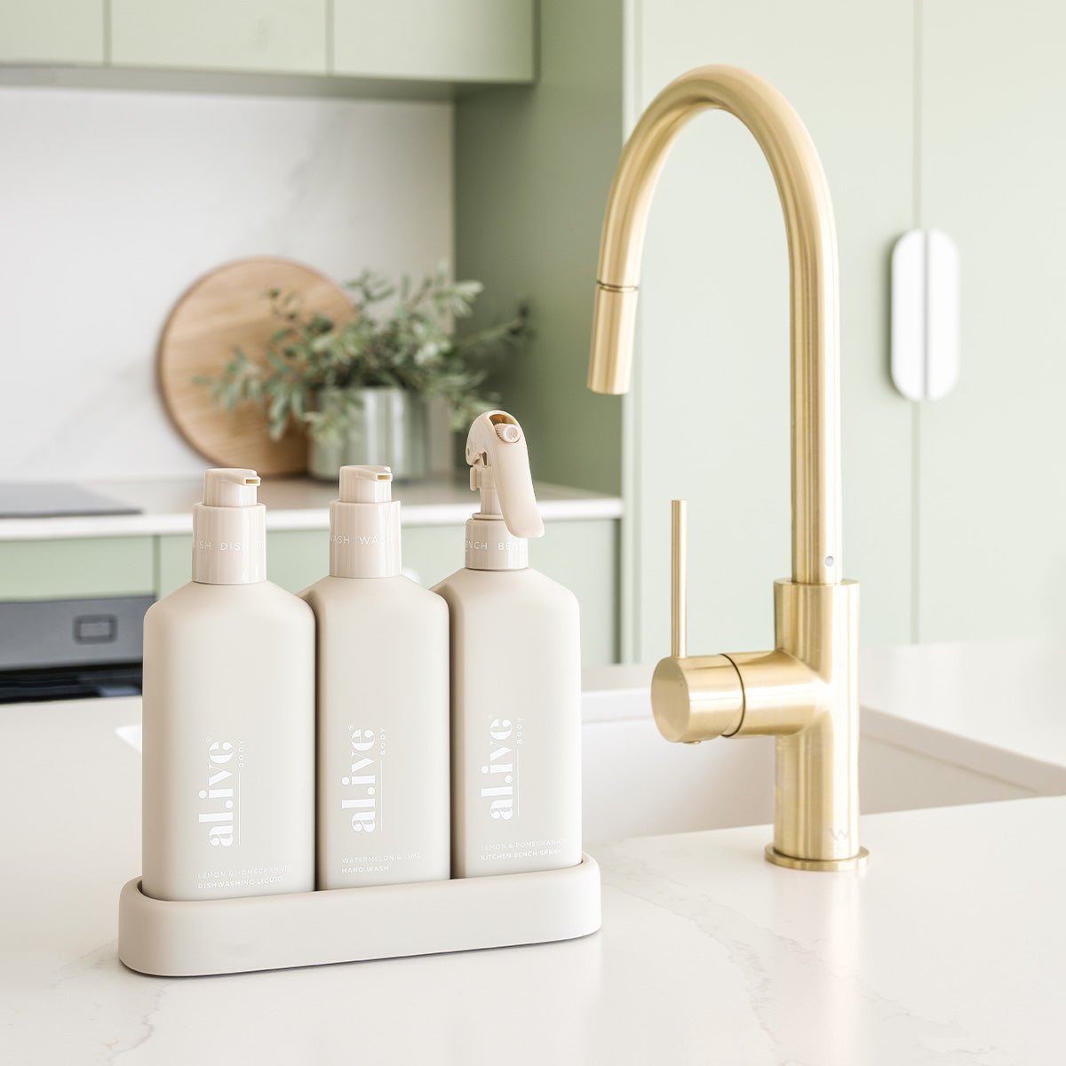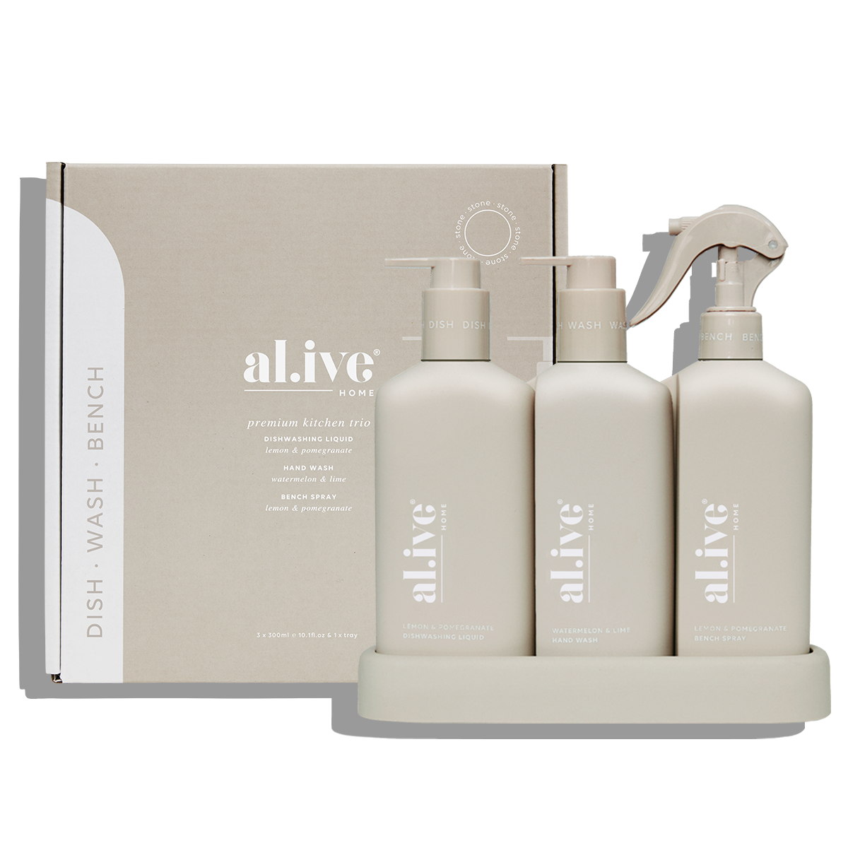 Introducing our Kitchen Trio - the ultimate solution for your kitchen cleaning needs. This set includes our Dishwashing Liquid, Bench Spray, and Hand Wash, all conveniently nestled within a beautifully designed custom tray.