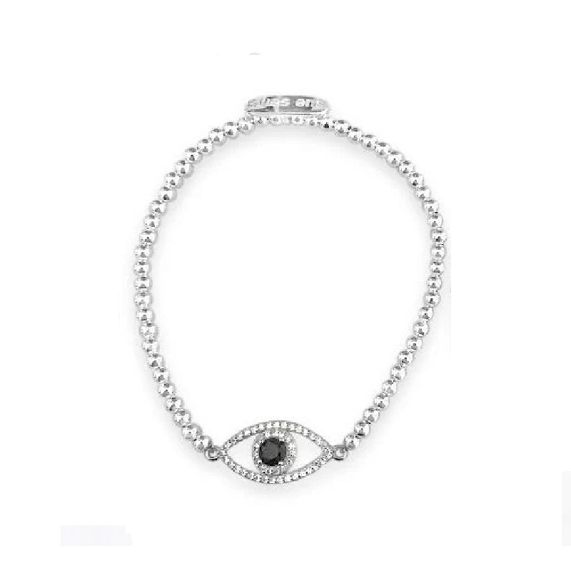 Protection Plus CZ black evil eye sterling silver bracelet on elastic by Sue Sensi.