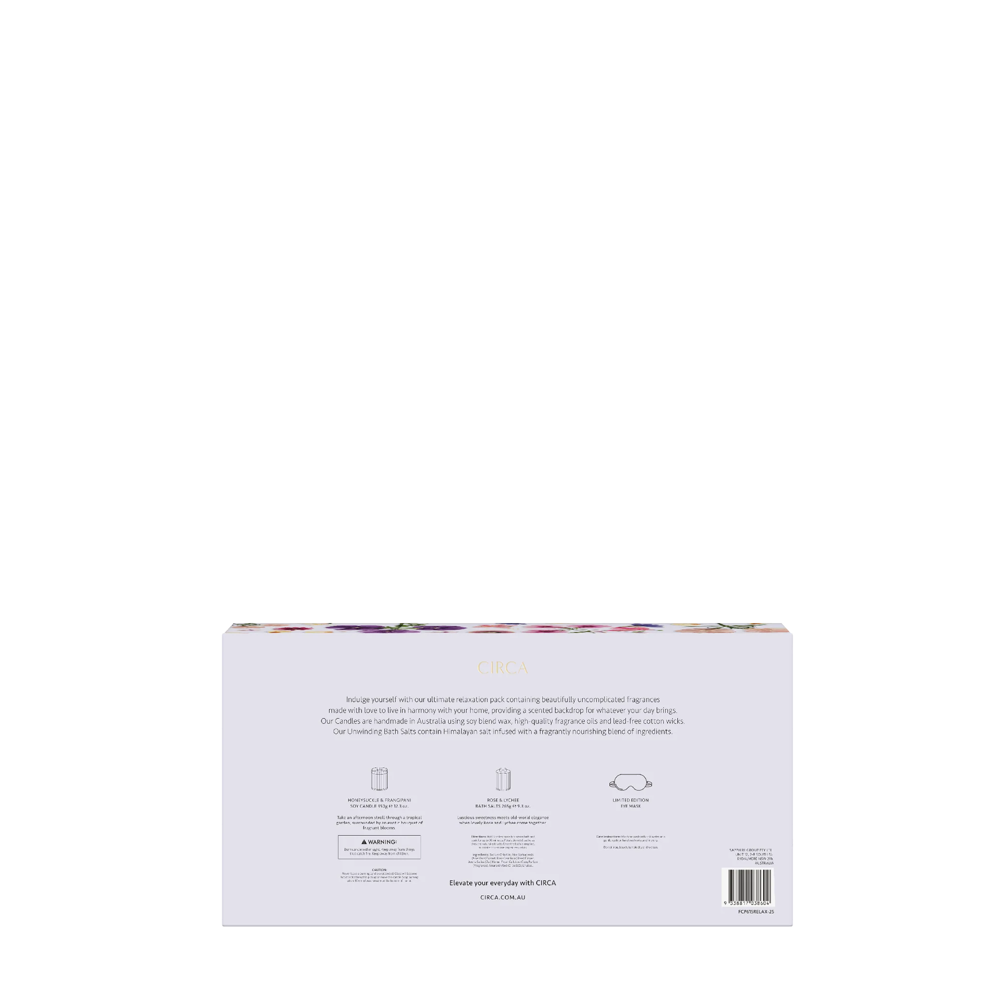 Contains: 1 x Honeysuckle & Frangipani 350g Soy Candle, 1 x Rose & Lychee 265g Bath Salts & luxurious Eye Mask