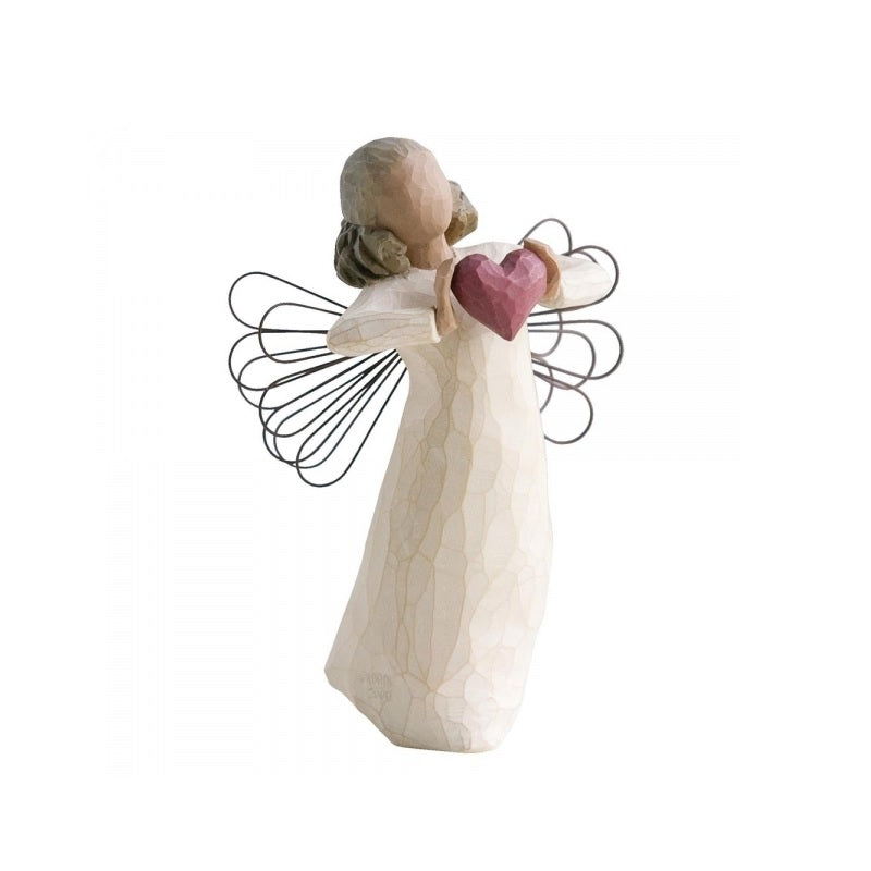 - Standing female angel with darker skin tone and hair color, in cream dress with wire wings, holding out a red heart in her hands